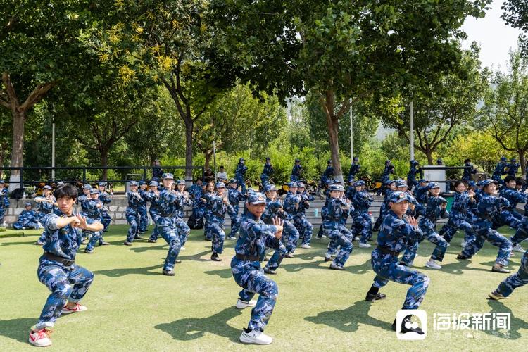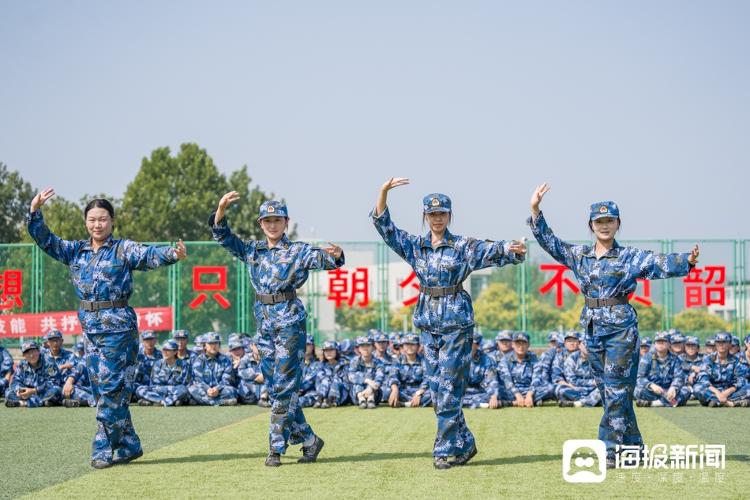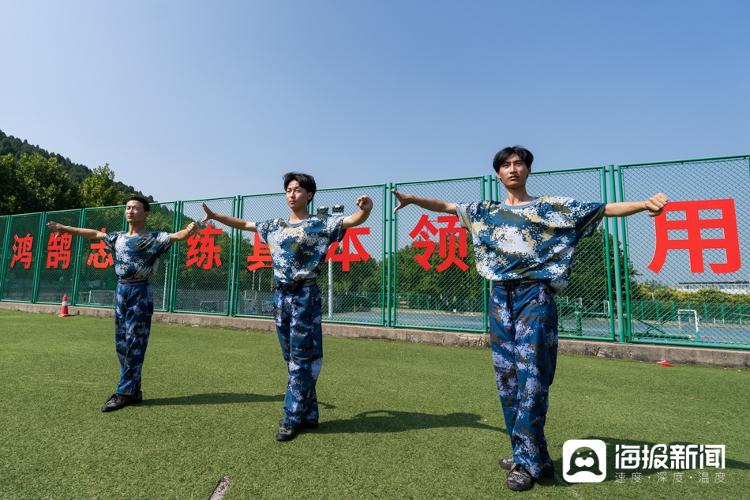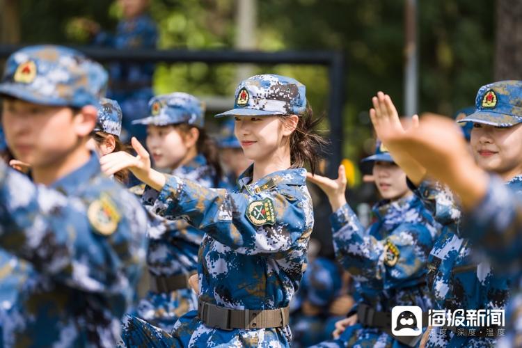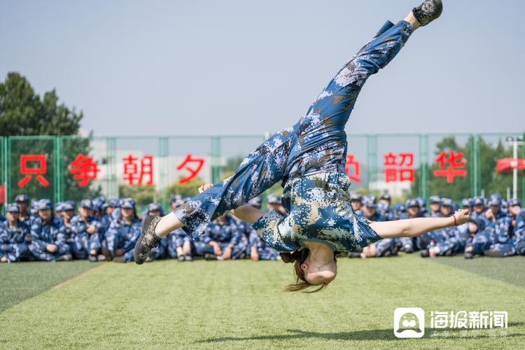 9月8日上午,在山东艺术学院长清校区操场,几位戏曲学院的新生正穿着军训服展示站提、飞脚、旋子等动作,引起现场阵阵掌声。此外,还有部分新生在教官的带领下练习军体拳,比传统军训项目添了几分“难度”,也增加了不少乐趣。