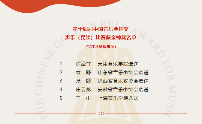 “中国音乐金钟奖”是由中国文学艺术界联合会、中国音乐家协会共同主办、全国唯一常设的音乐综合性大奖。10月15日至25日,第十四届中国音乐金钟奖在成都举行。本届金钟奖以“放歌新时代 奋进新征程”为主题,分别举办了开幕式音乐会、2场专场音乐会、2场金钟之星音乐会、颁奖典礼暨闭幕式音乐会等活动。在主体赛事比赛阶段,举行了包括声乐(民族、美声)、器乐(二胡、小提琴)两大类四个项目的复赛、半决赛、决赛共42场比赛。