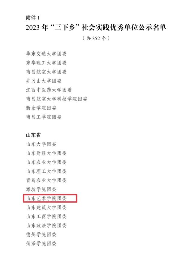 12月6日,共青团中央公布《2023年全国大中专学生志愿者暑期文化科技卫生“三下乡”社会实践活动总结通报结果》,山东艺术学院艺术管理学院“艺心”志愿服务队被评为2023年“三下乡”社会实践全国“优秀团队”,学校被评为“优秀单位”。这是该校“三下乡”社会实践首次荣获团中央表彰。