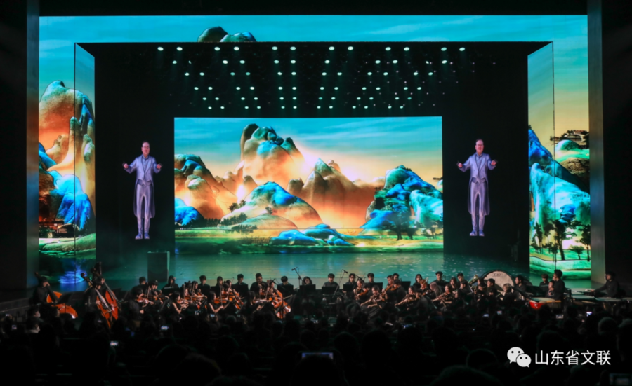 序曲《欢迎》拉开了演出序幕。此曲和《千里江山图》皆由中央音乐学院人工智能作曲系统作曲,该系统通过人工智能算法进行作曲、编曲、歌唱、混音,在23秒内即可快速创作出一首歌曲。两首作品通过数字人指挥的形式,由山东艺术学院交响乐团对作品进行了现场呈现。其中《欢迎》为管弦乐作品,通过丰富的配器方式,将铜管乐器的辉煌、木管乐器的浪漫以及弦乐乐器的温暖有机地结合在一起;《千里江山图》为交响乐,音乐主题取自我国古曲《高山流水》,将中国意象与西方现代作曲技术相融合,时而静谧悠扬、时而跳跃明快,以融古铄今的乐曲结合对传世名画进行数字艺术创新演绎,呈现出中国的壮美山河,彰显我国博大精深的古典艺术。