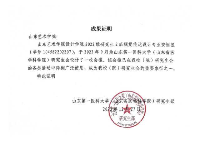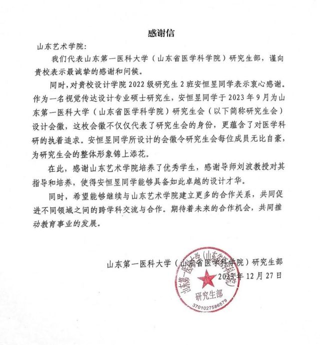 在信中,山东第一医科大学(山东省医学科学院)研究生部表达了对小安同学真挚的赞许,起因便是他为他们“独家定制”了一枚会徽。“会徽不仅代表了研究生会的身份,更蕴含了对医学科研的执着追求。”