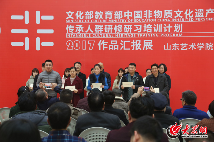 12月23日上午,文化部、教育部“中国非物质文化遗产传承人群研修研习培训计划”山东艺术学院2017年结业作品展在山东省文化馆开幕