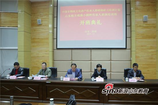 兰绍彤代表学校致辞,他向省文化厅对学校的关心、支持和帮助表示衷心感谢,向来自全省各地的培训班学员们表示热烈欢迎。他指出,山东省文化厅将文化部中国非物质文化遗产传承人群研修研习培训计划在山东的试点工作放到山东艺术学院举办,是对学校办学能力和办学条件的肯定与信任。学校将选配高水平专业教师,从专业技艺、表演身段、戏曲表导演创作理论、非物质文化遗产理论等多方面对受训学员开展培训,进一步提升受训者的综合理论素养,推进戏曲表演人才队伍梯队建设和山东地方戏曲可持续发展,为戏曲艺术的传承、发展和创新起到孵化助推作用。