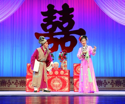 近日,山东省吕剧青年骨干演员集训班汇报演出在山东艺术学院举行。来自全省11家院团的30位吕剧青年才俊,为观众演出了《姊妹易嫁》《小姑贤》《逼婚记》等吕剧经典片段。为规范青年吕剧演员的表演身段和唱腔,提升理论素养,山东省文化厅联合山东艺术学院举办了为期一个月的集训班,受到基层演员的欢迎。图为汇报演出中,演员们表演吕剧《姊妹易嫁》选段。