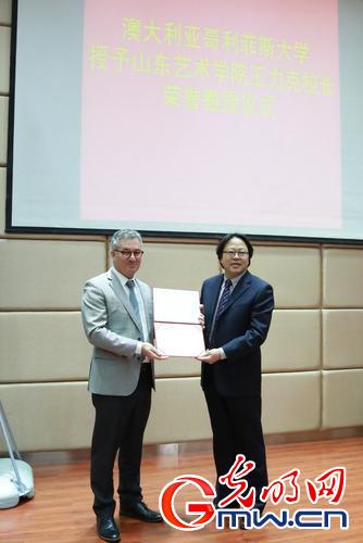 光明网济南3月22日电(李志臣 王志军)今天(22日)上午,澳大利亚哥利菲斯大学授予山东艺术学院院长王力克荣誉教授称号证书颁发仪式在济南举行。哥利菲斯大学昆士兰艺术学院院长Derrick Cherrie(德里克·彻理)教授为王力克院长颁发哥利菲斯大学荣誉教授证书。