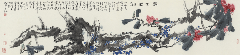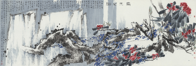 光伟先生表现高山杜鹃创造的独特形式技法,是他对当代花鸟画创作的新贡献!他将杜鹃的枝干画得老木虬柯,苍雄浑厚,有一种绝处逢生的伟岸气势,同时又将花叶画得清丽明快,静若处子,将大野之壮美与清秀之优美融为一体,得其杜鹃花木之自然天性。光伟画高山杜鹃,是对生命的渴望,对自然神圣的崇拜,我们赏鉴他的杜鹃,也是对生命的讴歌,对造化伟力的礼赞!光伟的高山杜鹃,创造了新的写意花鸟画形式,同时也提升了观者的生命境界和审美境界!