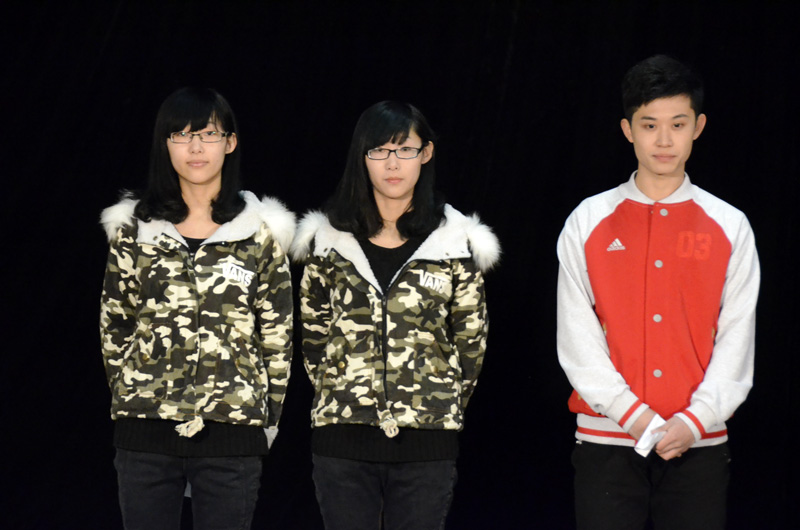 马上轮到姐妹俩上场了,两人频频向前望,有些小焦虑。三人一组的小品,她们担心会给队友造成不便,难以分清她们。