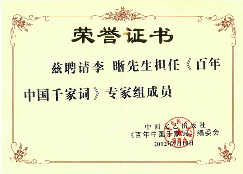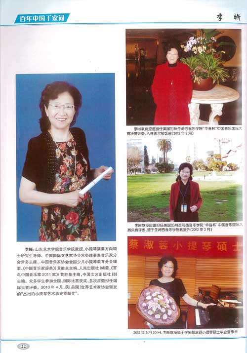 中国国际文艺家协会国际委员会委员和主席团成员、中国国际文艺家协会副主席兼音乐家分会常委主席,山东艺术学院硕士研究生导师李晰教授荣誉出任大型音乐辞书《百年中国千家词》编委会编委,该辞书近日已由中国文艺出版社正式出版。