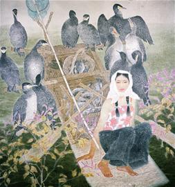 《月上中天》(198×189厘米)是梁文博2003年的作品,是作者探索由熟纸、熟绢向生纸结合画法转型期,也是画家工笔结合意笔的重要作品之一。画家曾多次去山东的微山湖、东平湖感受生活,寻找素材,表现了许多山东具有湖上风情的作品。《月上中天》就是这一时期的代表作。画面表现的是一位渔家少女夜晚迎着满月归来的场景,追求的是一种月色朦胧诗的意境。这与画家的文人情怀是分不开的。在画面处理上采用的是大开大合的满构图,使画面很有张力,把人物放置右下角,大面积让鱼鹰占有,这种大胆的构思在国内也是不常见的。在技法处理上,画家尽量把人物画亮使周围变暗突出人物形象,在人物面部刻画上结合工笔的技法,身体服饰和鱼鹰、船具则用工写结合的技法,使人感觉松紧有度。细节处传神耐看,但不失放松,写意处落笔大胆粗放但不失法度。画面上少女稳坐船头,后面是列阵的鱼鹰像战士一样守护着它们的收获,迎着满月归来,画家为我们营造了一个渔歌唱晚的空蒙意境。