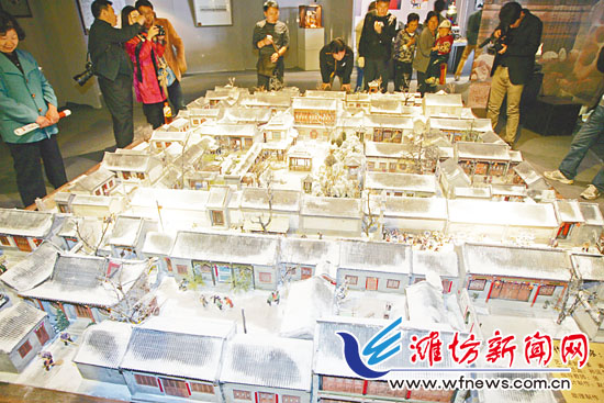 在山东艺术学院戏剧影视学院戏剧影视美术设计系的展区里,一组情景再现“十笏丰年”的雕塑吸引了众多人的眼球。这组雕塑还原了清末潍县十笏园的风貌,青砖青瓦的居民宅、商业店铺和繁华的商业街,以及潍坊风筝、朝天锅等都一一展现了出来。