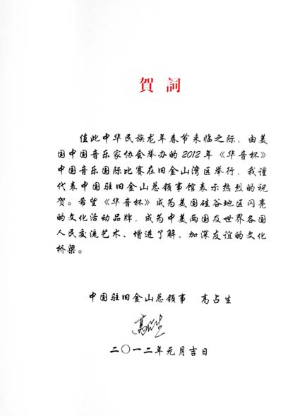 中国驻旧金山总领事高占生及大赛主席、美国华人音乐家协会会长田永平、大赛副主席郭珊、大赛评审委员会主任席强、副主任汤良兴和全体评委均出席隆重的颁奖大会及音乐会。