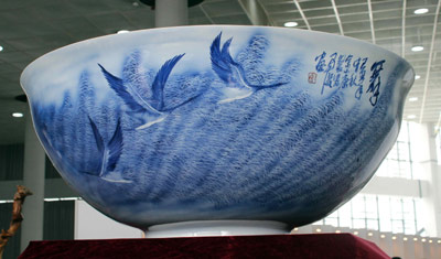 一只直径124公分、高49公分、最薄处不足2毫米的巨型薄胎大碗亮相博览会_ 此碗曾刷新了吉尼斯世界纪录,是迄今为止最大的釉下青花薄胎碗。