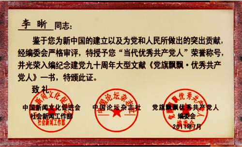 李晰教授2010年6月曾荣获世界艺术家协会(美国)颁发的“卓越(杰出)的小提琴艺术事业贡献奖”。美国世界艺术家协会主席Dr.Zal Delez在颁给李晰教授的证书签名并同时写贺信表示祝贺。