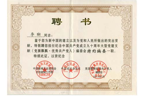 世界文艺讯:近日,中国国际文艺家协会国际委员会委员和主席团成员、常务理事兼音乐家分会常务主席、山东艺术学院音乐学院硕士研究生导师李晰教授,荣获《党旗飘飘·优秀共产党人》大型系列经典文献邀请担任特约编委的通知和聘书,并被《党旗飘飘·优秀共产党人》编委会授予“当代优秀共产党人”荣誉称号证书、“当代优秀共产党人勋章”。同时被聘为《中国音乐家图典》编委会常务副主编。