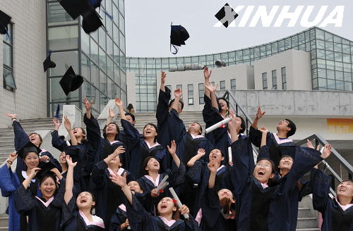毕业典礼结束后,同学们欢呼着把硕士帽抛向空中