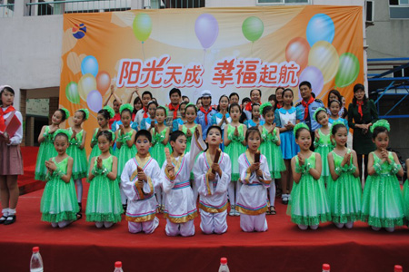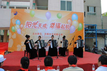 5月31日下午,济南市天成路小学校园里到处洋溢着欢声笑语,学生盼望已久的“阳光天成幸福起航”庆六一联欢活动在姚晶校长热情洋溢的节日贺词中开幕了。学校老教师、山东艺术学院音乐教育学院的大学生及天成路小学学生同台献艺,小合唱、舞蹈、阳光球操、配乐诗朗诵、乐器表演等精彩纷呈。台下的小观众们和着欢乐的节拍,台上台下连连互动,掌声此起彼伏,大家完全沉浸在节日的快乐之中。演出结束后,台上台下,大家手拉着手,肩并着肩,唱着、跳着,将庆祝活动推向了高潮。