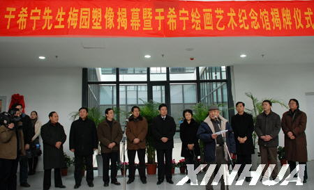 新华网山东频道12月28日电(汤乙清 邹坤萍)28日上午,山东艺术学院长清校区雪花漫舞。国画大师、美术教育家于希宁先生梅园塑像暨于希宁绘画艺术纪念馆落成仪式在这里举行。山东省委常委、宣传部部长李群与山东艺术学院党委书记柳文敏共同为座落于梅园中心的于希宁先生雕像揭幕。于希宁家属代表以及来自社会各界的友人、山东艺术学院三百余名师生参加了落成仪式。