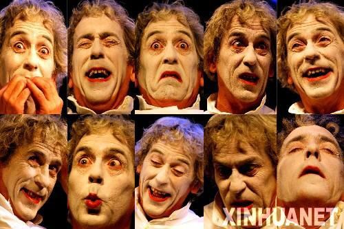 11月23日拍摄的菲利普·比佐默剧大师表演中的不同表情(拼版图片)。 当晚,法国默剧大师菲利普·比佐在山东艺术学院大剧场表演其代表作、2007年智利国际默剧节获奖作品《三十年之静》。新华社发(陈长礼摄)