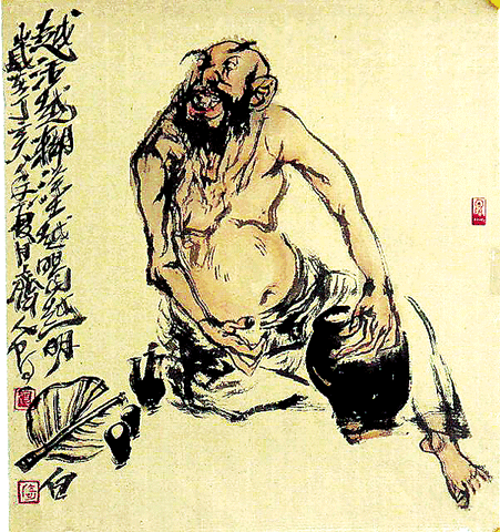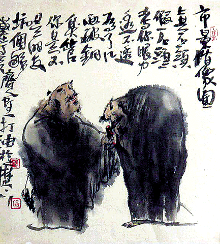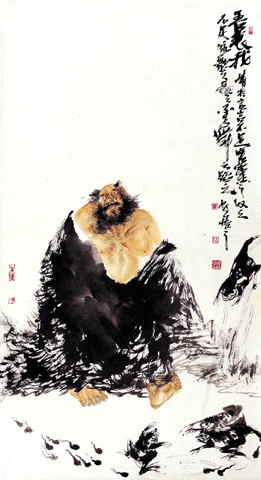 阿一作画至兴,常裸足赤膊,忘却身在何处,不知今夕几何,笔下或钟馗,或罗汉,或荆柯之辈,行走于江湖风云,与酒肉豪情为侣。阿一笔下无纤弱书生,常多豪侠武人,多类鲁智深、武松,江湖尘缘难了,而一闻涛声,竟彻悟天地生命之道。虽画古人,亦写阿一之心也。