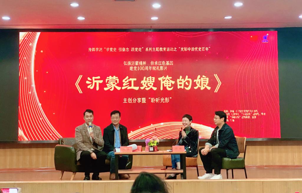 4月22日,传媒学院党总支举办“弘扬沂蒙精神 传承红色基因”为主题的电影《沂蒙红嫂俺的娘》观影暨主创人员分享主题党日活动,拉开了传媒学院“光影中的党史百年”党史学习教育系列主题活动的帷幕。活动邀请该电影编剧李超,电影策划及该片“聆听光影”版编剧、导演于晓风,“聆听光影”版副导演、主演杨璐等电影主创人员参加,传媒学院党政负责人、全体师生党员及入党积极分子200余人参加活动。