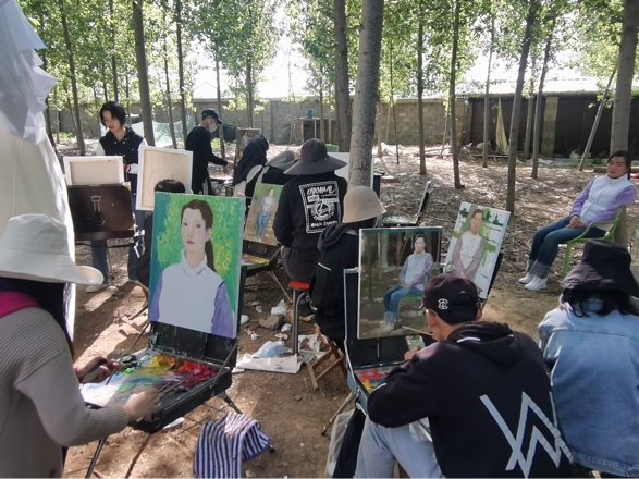此次课程由外光人像写生和风景写生两个部分组成,旨在巩固学生对色彩的把握,提高学生在外光条件下的写生能力,为艺术创作打牢基础。课程利用第二课堂和实践基地的资源优势,组织全体学生参观铁道游击队纪念馆,观摩中央美术学院丁一林教授为纪念馆所创作的大型历史画《投降》;师生们为当地的老党员、老军人进行人像写生,并聘请他们讲解个人的战斗故事和奋斗历史,对当地的历史和风土人情有了详细了解,更好地将红色文化融入到专业创作中,做到学史明理、学史增信、学史崇德、学史力行。