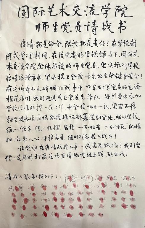 近日,在学校封闭式管理期间,国际艺术交流学院全体在校师生党员成立疫情防控先锋队,自发签下“抗击疫情请战书”,一个个鲜红的手印,一句句坚定的誓言,展示了团结一心、共克时艰的信心和形象。