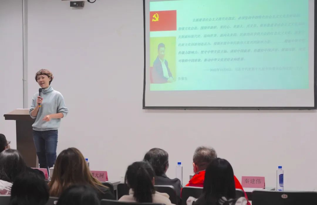 于晓风以《中国文化的国际传播》为主题作宣讲,她以习近平总书记在党的二十大报告中关于“讲好中国故事”的要求为切入点,围绕文化与国际传播、中国文化国际传播的途径与现状和当前中国文化国际传播的问题分析及应对三个方面,分析了中外文化交流的具体实例,深刻阐释了当前我国文化走向国际中遇到的种种困难,科学解释了应对目前对外文化交流有关问题的方式方法,使同学们明确了未来的奋斗方向。