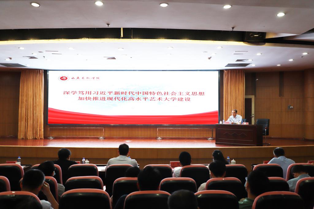 王洪禹以《深学笃用习近平新时代中国特色社会主义思想 加快推进现代化高水平艺术大学建设》为题,从“深入学习中国式现代化理论,坚持不懈用习近平新时代中国特色社会主义思想凝心铸魂”“完整准确全面领会贯彻习近平总书记对山东工作的重要指示批示精神和关于教育、文艺工作的重要论述精神”“深入践行习近平新时代中国特色社会主义思想,加快推进现代化高水平艺术大学建设”“坚定不移坚持和加强党的全面领导,以高质量党建引领学校高质量发展”4个方面作了系统讲解和深入阐释。