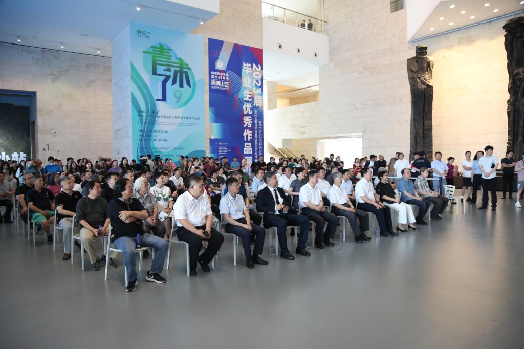 7月8日,山东艺术学院建校65周年暨“闳美山艺”毕业展演季2023届毕业生优秀作品展开幕式在山东美术馆举行。省教育厅副厅长张志刚,省委宣传部原副部长、省文旅厅原厅长徐向红,济南大学党委副书记、校长刘宗明,山东中医药大学校长李可建,山东工艺美术学院党委书记王晓娟,齐鲁工业大学党委副书记吴衍涛,邢台学院党委常委、副校长王自力,省文旅厅艺术处处长张东林,济南市文旅局党组副书记、副局长苏文,济南市民政局副局长郭爱武,省文联文艺部主任王德斌,省文艺创作研究院院长王宇鹏,省美协常务副主席张宜,省美协副主席、山东美术馆馆长杨晓刚,省话剧院院长董璇,省书协驻会副主席王瑞,省电影家协会驻会负责人杨峰,山东艺术学院院长徐青峰,原院长王力克,党委副书记杨西国,党委委员、纪委书记、省监委驻学校监察专员胡凤莹,党委委员、副院长苏茂兴,原副院长刘大力,党委委员孔宪坤参加开幕式。著名老艺术家和专家教授李振才、陈建华、李勇、岳海涛、刘青砚、李平及来自各兄弟院校和社会各界的嘉宾300余人参加开幕式。
